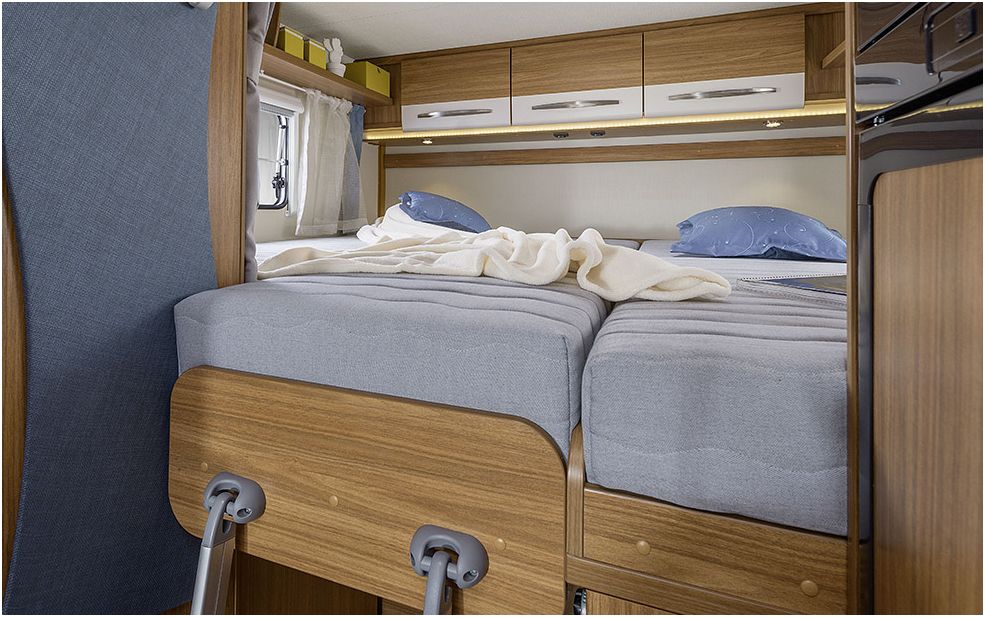 Of course the beds are equipped with high class matrasses, which guarantee a comfortable night. In the front area the motorhome is equipped with a folding down bed, which size is 140 Meters wide.